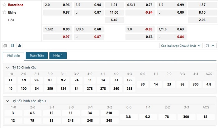 - Kèo chấp hiệp 1: Barcelona -0.5/1