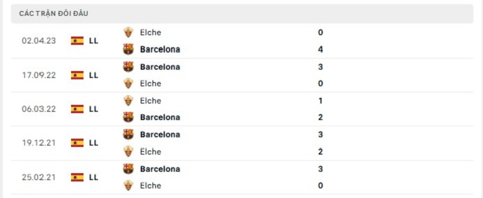 Barcelona luôn cho thấy thực lực và sự vượt trội của mình trước Elche, điều này được thể hiện thông qua 5 lần gặp nhau trước đây họ có thành tích toàn thắng trước đối thủ này.