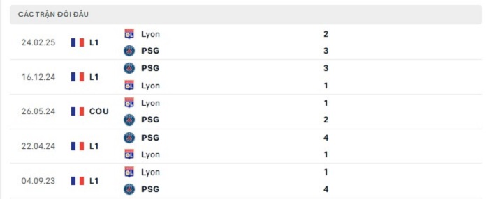 Lịch sử đối đầu của Lyon vs Paris Saint-Germain