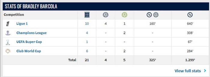 Lịch sử ghi bàn trong 5 trận gần nhất của Bradley Barcola (Ngôi sao của đội Paris Saint-Germain)