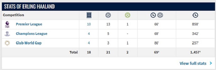 Lịch sử ghi bàn trong 5 trận gần nhất của Erling Haaland (Ngôi sao của đội Manchester City)